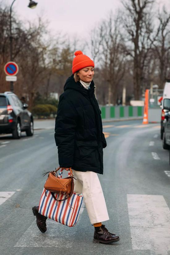 豆豆帽是最常见的啦,只要平时戴帽子的,基本上人手一顶。它很“亲民”,搭配上基本没什么禁忌。当然啦,也别刻意考验它的适应力,你穿晚礼服的时候,还是别让它出现为妙。