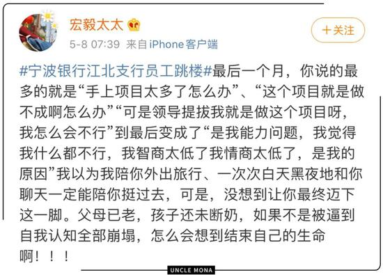 马云曾在最近一次直播中提到: “现在的时代,每个人的压力都很大。 年轻人要是怕压力,就白活了。” 但可惜,不是所有人,都有马云的实力和运气。 也不是所有“压力”都能转化为催人进步的动力。 5月6日,宁波银行一位经理跳楼轻生。 在此之前一个月,他说的最多的就是: “手上项目太多了怎么办?” “做不完了,我真的不行……” “是我智商太低了,是我的原因。” 超强的工作任务和精神压力,让这个厦大的高材生,崩溃了。