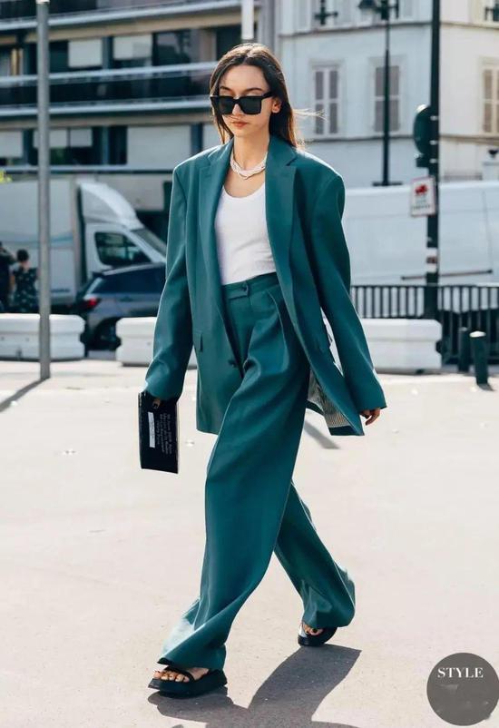 鼠尾草绿的饱和度和明度都非常低,更像是灰绿色,知性低调,非常适合用来演绎大女人风穿搭。