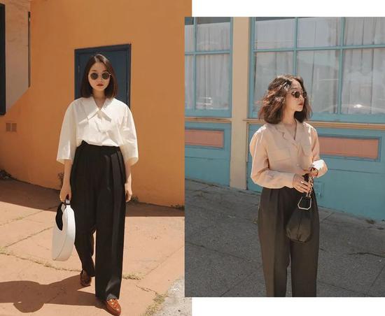 最简单的,就是搭白色上衣了,什么T恤、衬衫,没有阔腿裤不能驾驭的。