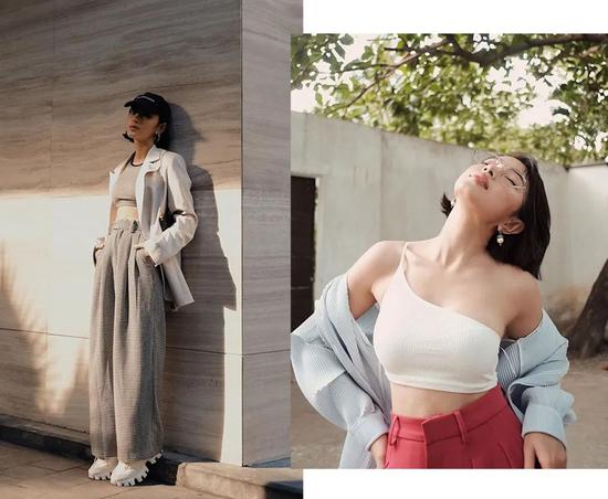 把抹胸小上衣穿出潮流酷girl感就很厉害了,让你有一种也可以这样出门的错觉。