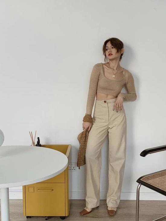 这种短款的针织衫我也很少穿,它温柔中带点休闲感。有马甲线的朋友穿这件就是你们的时髦利器咯! 搭配的裤子来自IMMI,那天在深圳新开的SND买的,版型真的太好了!!梨形身材穿上什么烦恼都没有了哈哈哈。适中宽度的直筒裤,把腿形修饰的堪称完美。裤头部分设计也没有太复杂,是我很喜欢它的一点,腰臀的连接显的很轻盈。