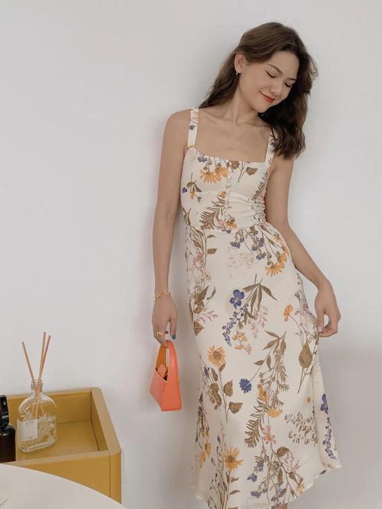 这套的重点在于这条裙子,最喜欢它的印花,它不是很夏天的碎花,反而是秋天落叶的感觉。还带一点点的橙色和蓝色,整个图案看起来就很舒服。胸前的设计做得也很好,大的U型领,穿起来大方也不裸露。 外面披了一件上面look出现过的橙色衬衫,南方的秋天这样穿也不会太冷。衬衫的颜色和一个小小的亮橙色包在秋日里点亮心情。
