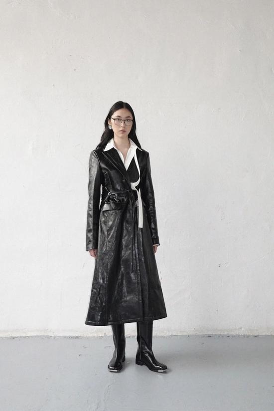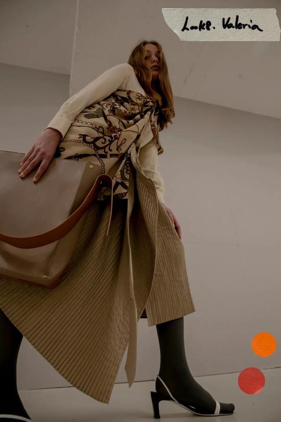 包包选择了BV的手拿包,因为裤子和上衣都偏浅,刚好这个包包的棕色融合进去就会有亮点。 Manu的鸭嘴靴刚好是这两个颜色的拼接,起到整体呼应的作用,光滑皮面的材质上也给整套look的质感加分不少。