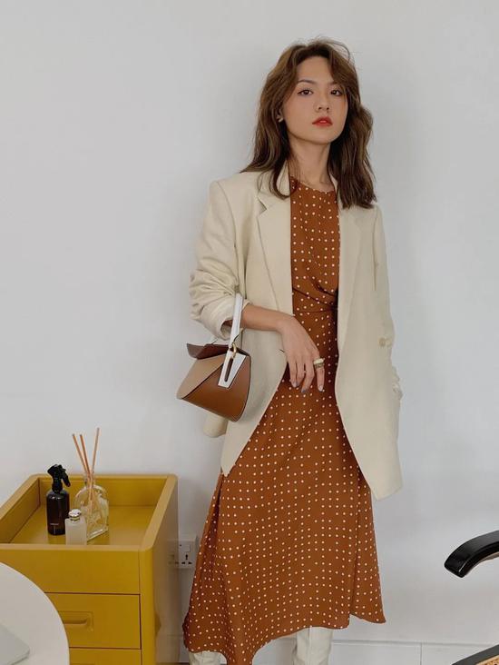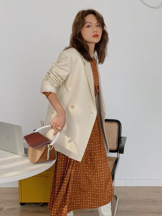 刚过完周末迎来新一周的第一天,不想让自己穿的那么正式,想在穿搭上延续周末的愉悦感又想表达「认真工作的决心」,所以选择了长裙+西装的组合。 秋冬的主色依然是棕色调,今年的第一套fall outfits,就以这个色调来开篇吧~ 外套:TOTEME 连衣裙:C/MEO COLLECTIVE 靴子:RAYE 包包:YUZEFI 戒指:Picnique