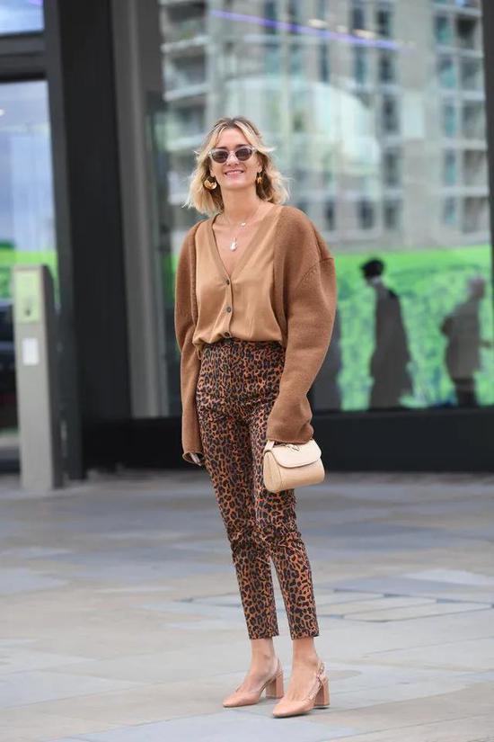 或者选一个亮一点的颜色,如果觉得搭配花纹裤还是有风险,那么就换牛仔裤,反正万年不会出错就对了。
