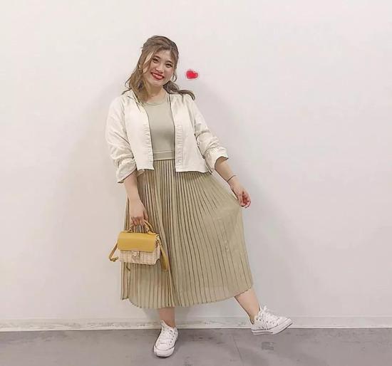 即使是初秋,Jess也不忘偏向于活力的氧气少女感,秋日黑白灰等冷淡的颜色在她身上都很难找得到~Jess可以说是言传身教地用色彩向我们说出,微胖的女孩到底能有多可爱~