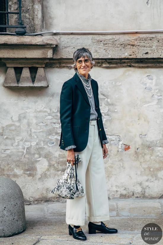 黑白小格子的碰撞简约高级,搭配西装外套袖口露出一点格子很有腔调和个性,裤子建议也搭配同样风格的西裤或者阔腿裤。珍珠项链作为饰品又增加了些雍容大气,整套搭配都不挑年龄哦。