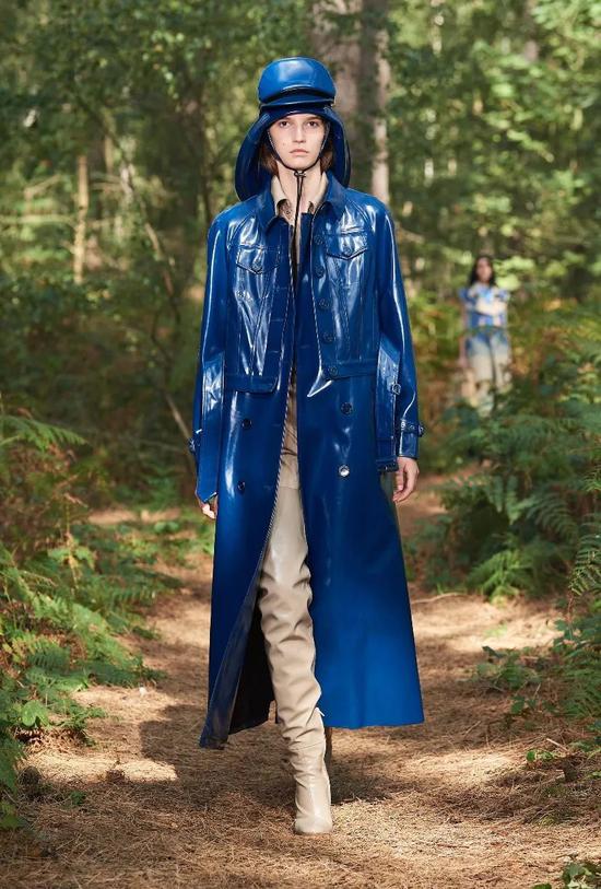 而在2021春夏秀场上,Burberry的首个look依然是他们经典的风衣,只是不同之处在于,他们为风衣增加了年轻的牛仔元素,做成了假两件的效果,卡其色与蓝色,经典色系和海水之蓝,仿佛遥远的天海界限,充满无限的生命力。