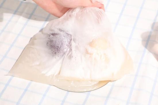 在装完少量水以及海绵蛋的袋子里面挤入是适当的洗涤剂,我一般就是和水是1:4左右~