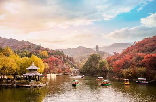 02 济南的秋 一片山的烂漫 秋天,最喜欢去山上看满山红叶了。 而红叶谷就是济南看红叶的不二选择。 到了晚秋,红叶谷拿出了与晚霞一争高低的气势,一时间,整个山头都变成统一的红颜。 不管是漫步其中,还是荡船欣赏,都仿佛身临仙境一般不真实。