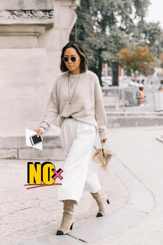 阔腿裤和短靴一起穿其实真的没毛病,只要——你不要刚好选到靴筒臃肿、不贴合腿部线条的短靴!阔腿裤看起来就够“膨胀”的了,如果还不在脚踝处往回“收”,那整个下半身,就真的看起来跟阔腿裤看起来一样宽了~