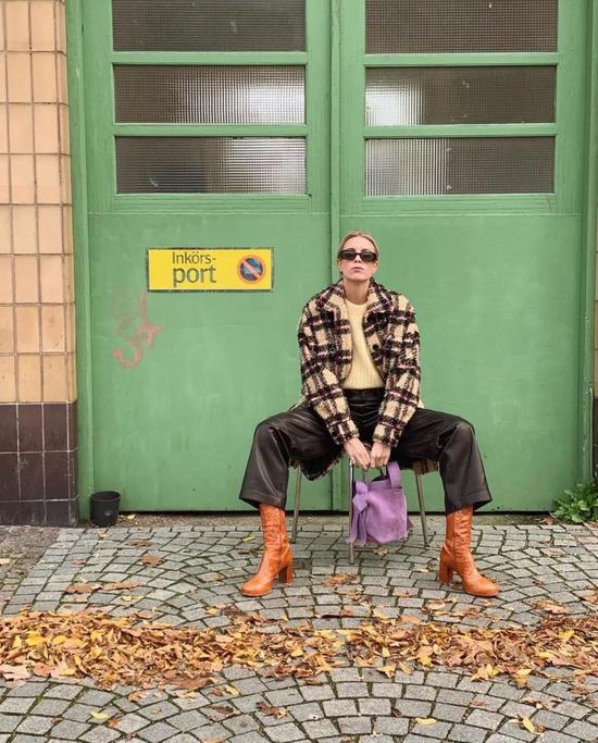 比起亮闪闪的质地,哑光面料更能凸显质感。穿上枫叶色的靴子最适合在秋天铺满落叶的地上拍照了。搭配复古格子款羊羔毛外套保暖又有腔调哦。