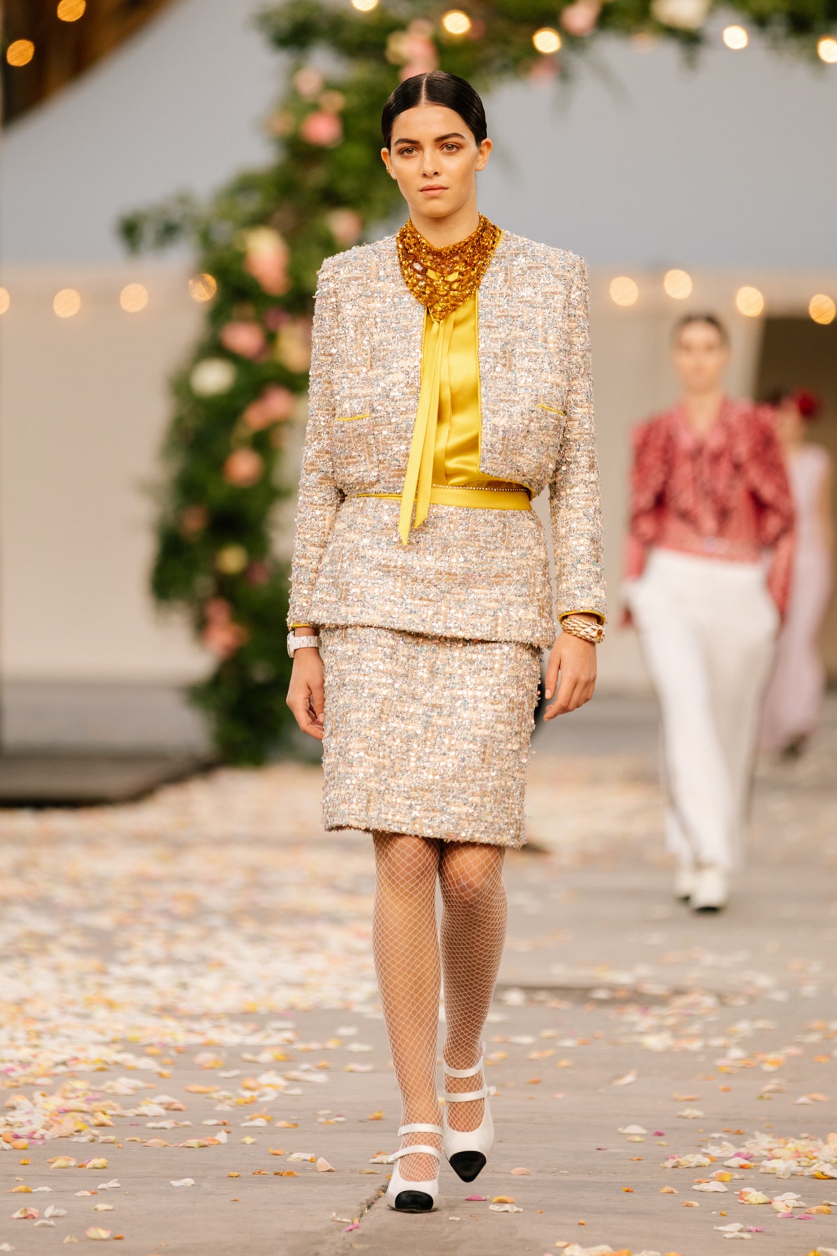 正像前文中提到Virginie Viard对这一季高定系列的诉求一样,是想要打造一场像家庭聚会一样的女性氛围,那么婚礼就更能成为这场女性氛围聚会的典型了,盛装出席的女士们既是在装扮自己,也是为婚礼现场主角最真挚的祝福。 这些祝福可以是洋溢着轻快的、也可以是庄重而肃穆的长裙。
