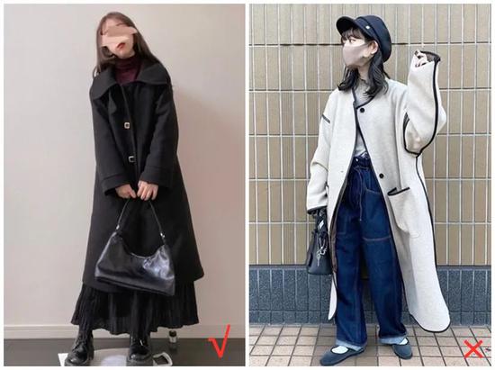 四、大衣不要选宽松 小个头女生是可以穿大衣的,只不过衣身长度和衣身版型要格外注意。 大衣不要选择过于宽松的,oversize版型虽然流行但还是需得视情况而定。