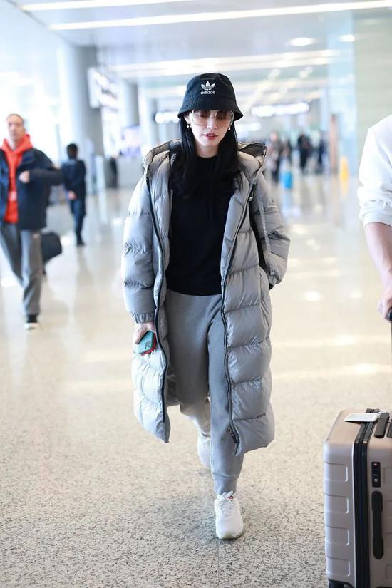 戚薇身穿品牌chen peng的薰衣草紫色长款羽绒服亮相机场,内搭白色连帽卫衣与运动裤,清爽大方,脚踩异形鞋跟踝靴,气场加分。