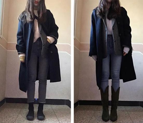 ▲谁说外面穿着毛呢大衣,内搭就不能再是毛呢的了?sunnn__y也会用大衣混搭毛呢西装,这种穿法非常适合上班族,进到暖和的办公室直接脱掉大衣。小个子女生建议搭配V型靴口的长靴,因为它要比踝靴更显高一些。