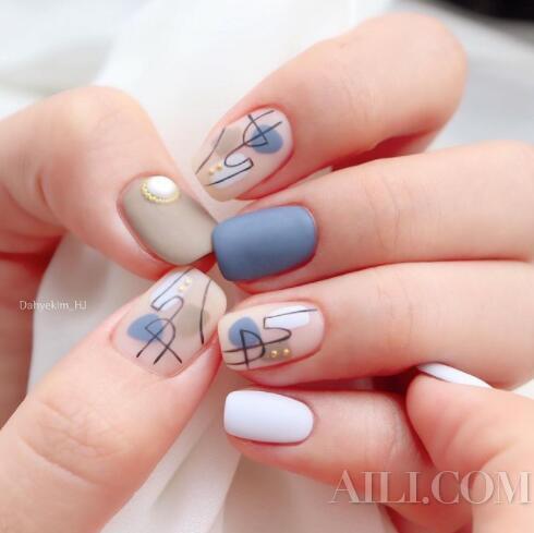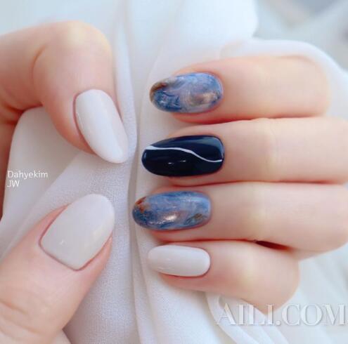 不想要太过浮夸,可以做奶白色的跳色来平衡,让美甲多些留白。蓝色与白色搭配,真的是越看越耐看。