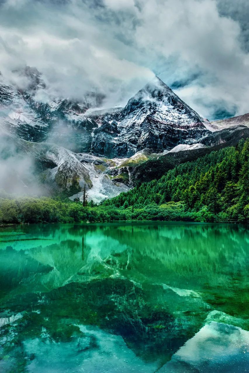 忽然云层被阳光撕开了一道裂缝,把原本碧绿的五色海照成了一团粉蓝色的玉石一般。 恍惚间,好似闯入一副千万年前就形成油画中,不由自主的融入其中。 湖水倒映着雪山,雪山环绕着湖面,五色海的美丽,是天地间共同的作品。