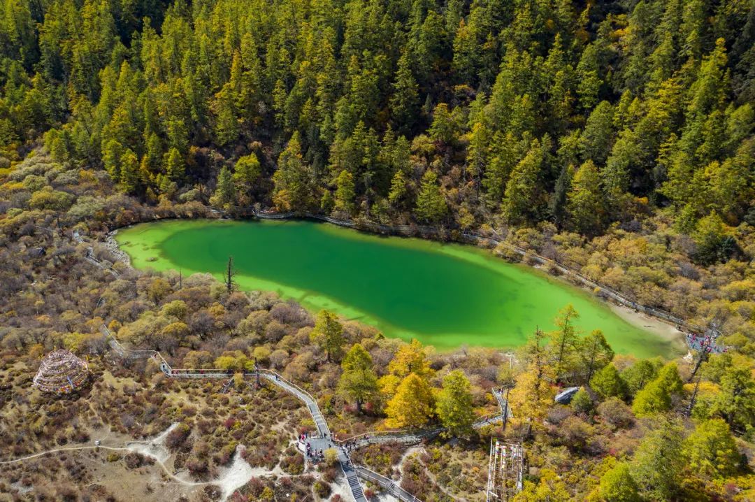 或许所有的美,都不是孤立的。 珍珠海的美更是如此。 美在它背后的仙乃日神秘雪山,美在它被严密的裹在了秋日姹紫嫣红的色彩里,此情此景,不是人间,胜似人间。 装满了雪山的美丽,围绕着密林的情爱,映照着蓝天的清澈,你说上帝真的没有偏爱它吗?很难相信。