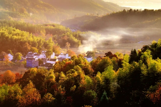 远处的青山,化成淡墨一笔。 红枫后飞檐翘角的影子,让人心动,无边的诗意蔓延开来。 也难怪人们不惜用所有赞美之词来形容这片土地: 诗词中写的秋,在这里都可以读懂;童话中才有的秋,在这里都可以看到。