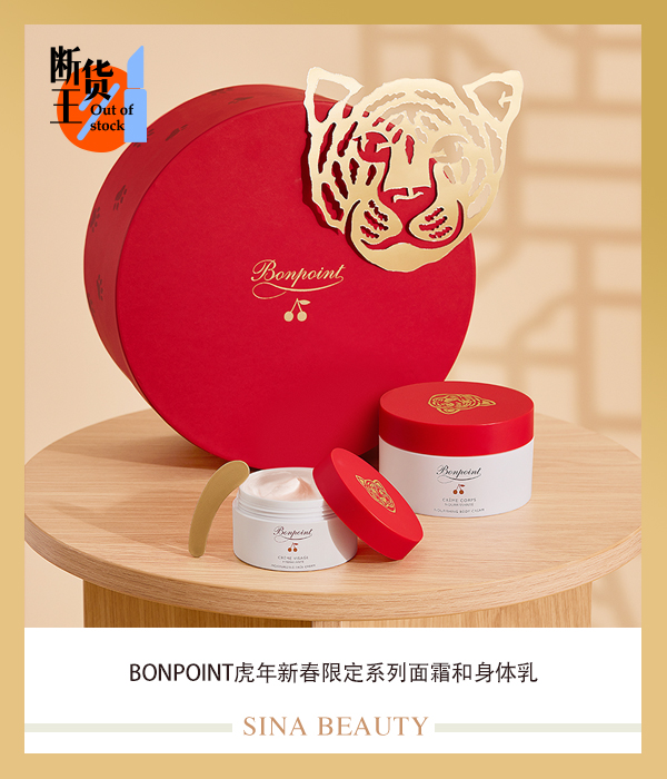 2022年悦诗风吟潮玩虎年限量版-红茶家族 悦诗风吟2022年潮玩虎年限量版包含潮玩虎年限量版红茶青春焕活护肤水乳套装、潮玩虎年限量版红茶青春焕活护肤安瓶精华套装、潮玩虎年限量版好运上上签四重奏套装、潮玩虎年限量版石榴活妍菁华遮瑕气垫粉底液21号套装、潮玩虎年限量版红印唇享甲油套装和潮玩虎年限量版棉花糖粉扑套装。每款新年限量产品被赋予了不同的“猛虎”造型,大面积的红色和金色渲染画面营造出浓烈的春节欢乐气息。 Bonpoint虎年新春限定系列挚爱面霜与挚爱身体乳霜